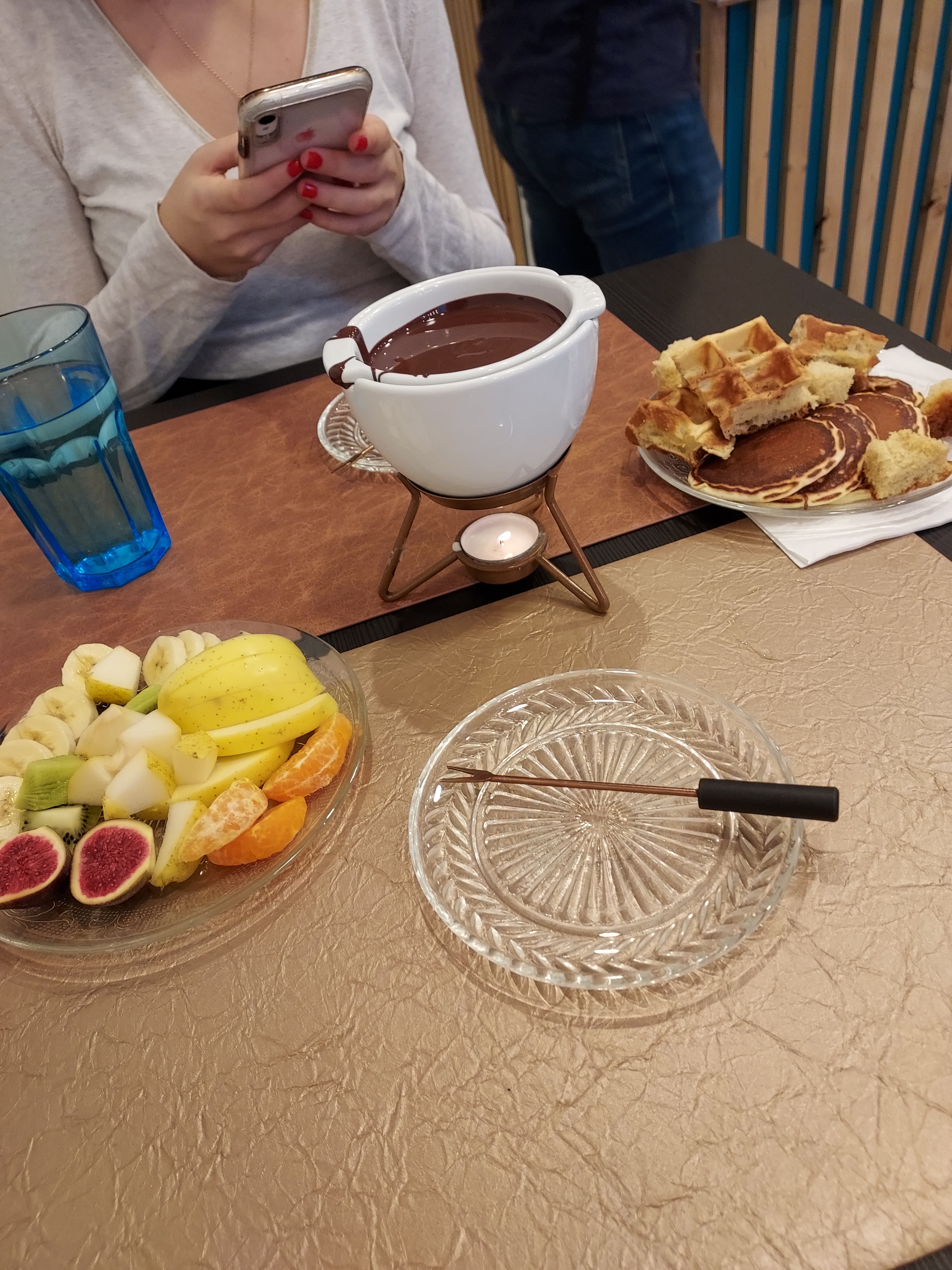 Je suis allé avec mon ami pour prendre une collation. Nous avons mangé une fondue au chocolat et c’était la meilleure chose que j’ai jamais mangée de toute ma vie. Je ne plaisante pas, je suis allé au paradis et je suis revenu. De plus, le personnel était super sympa et même si nous ne parlions pas un mot de français, ils étaient très gentils avec nous et compréhensifs. L’ambiance est incroyable, c’est un endroit idéal pour passer un après-midi. Le prix est correct, nous avons dépensé 10 € par personne mais nous avons eu beaucoup à manger. De plus, vous pouvez dire que toute la nourriture était fraîche et les fruits fraîchement coupés. Vraiment une expérience incroyable, je le recommande à 100% ! :)