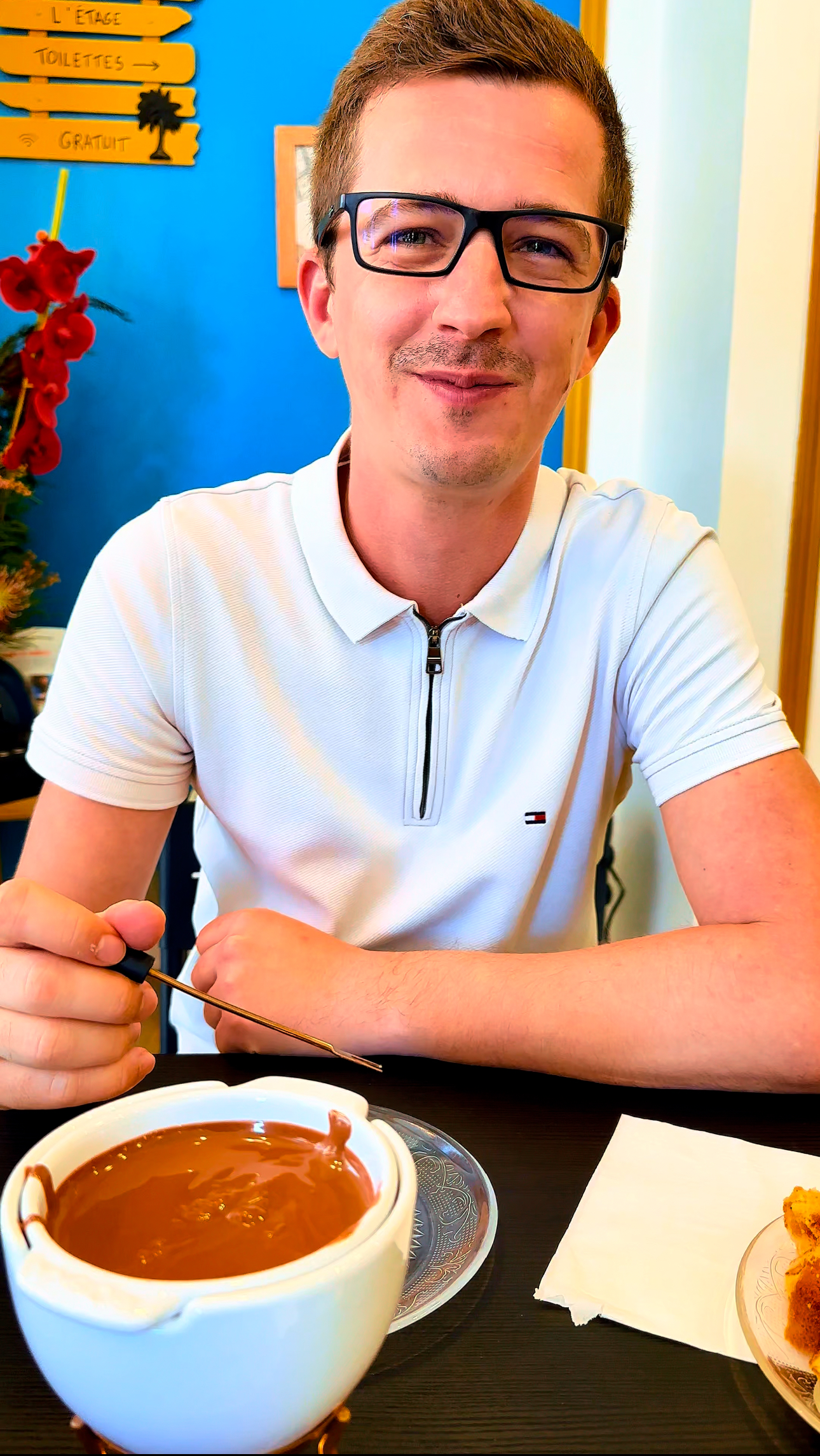Un papa fier du travail accompli ! Endroit charmant pour venir déguster des plats à base de chocolat. C'est excellent ! Merci et bravo à Emma et Vanessa !